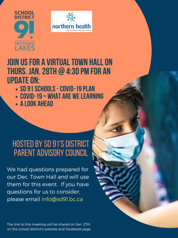 Please join our virtual Town Hall event hosted by our DPAC and featuring guests from Northern Health Thursday January 28, 2021 at 4:30 pm. You can access this event by clicking HERE.