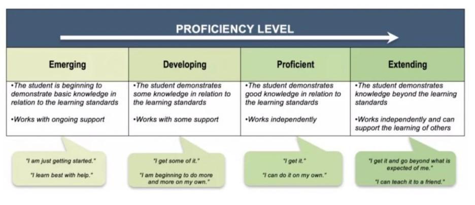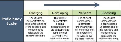 The Emerging (EMG) - Developing (DEV) - Proficient (PRF) - Extending (EXT) scale is already employed in the Provincial Assessments for Grades 4, 7, 10, and 12. The Proficiency Scale will be utilized in learning updates and summaries of learning (formerly known as report cards) starting in the 2023-2024 academic year.
